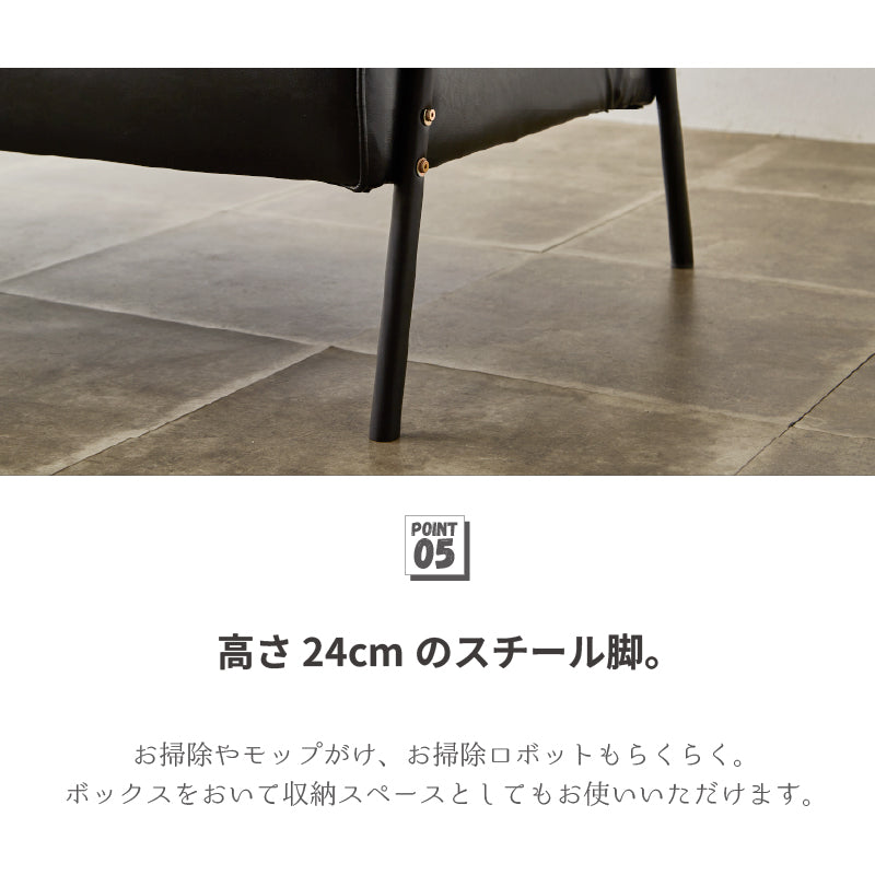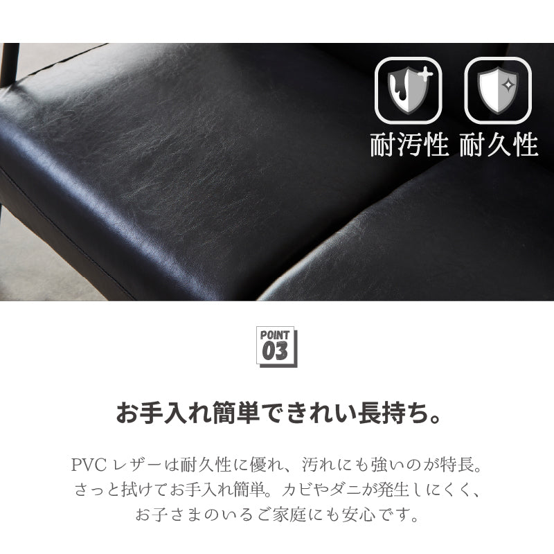・ヴィンテージ風のおしゃれなデザイン ・本革風の素材で高級感を演出してくれます。 ・無骨なスチールと味のある木肘。 ・PVCレザーなので、耐久性が高くお手入れが簡単です。 ・体を支えてくれる安心感ある座り心地でヘタレにくい仕様となっております。 ・脚の高さが24cmでお掃除ロボも使用可能です。
