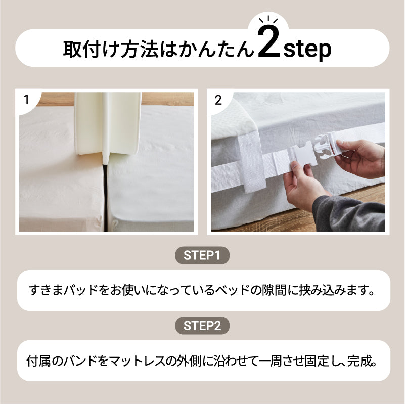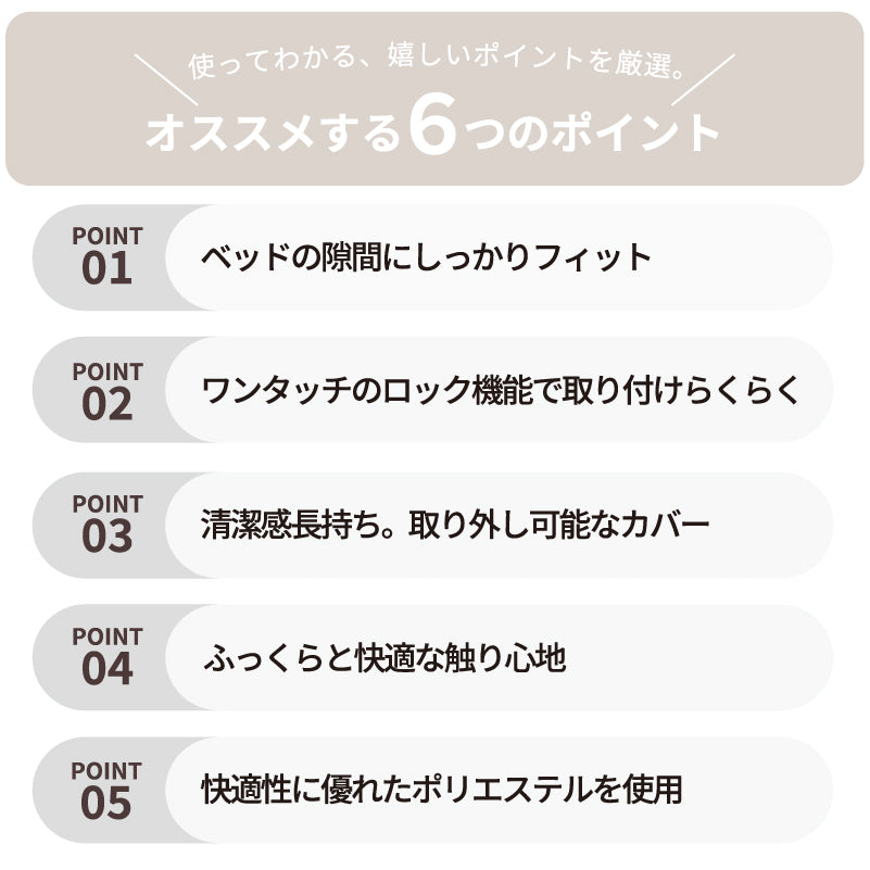 ■ベッドの隙間に差し込む長さは6.5cm。寝返りをうってもズレにくい仕様 ■固定用のバンドは、簡単なロック機能でらくらく ■ワイドな横幅30cmでベッド間の違和感を大幅に軽減 ■取り外し可能なカバー(手洗いOK) ■ウレタンフォームを使用しており、ふっくら快適な触感で快適な寝心地 ■カバーには、耐久性・速乾性に優れたポリエステル生地を使用 |