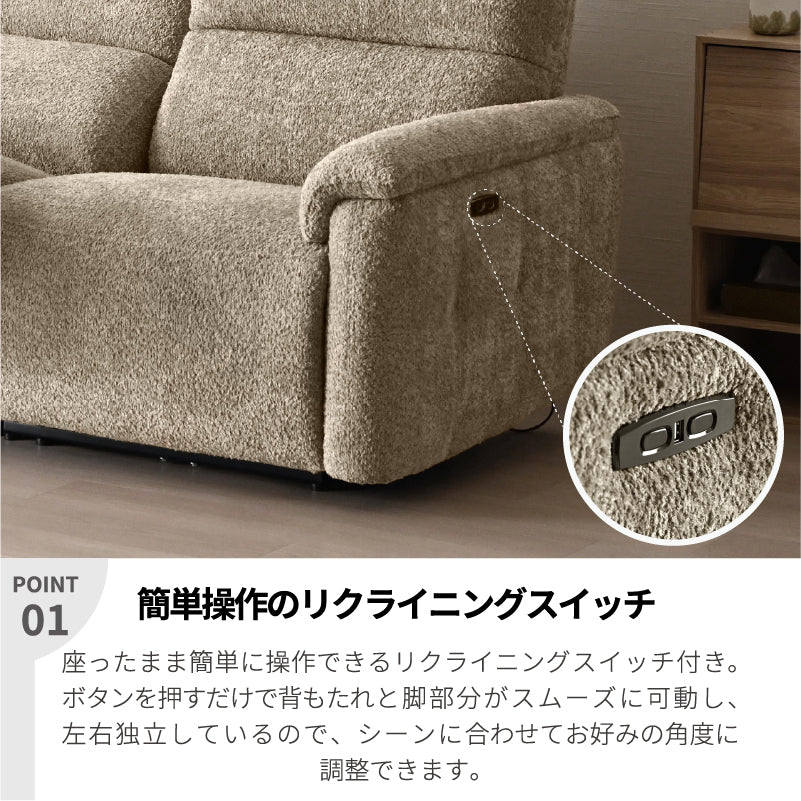 ・140°までリクライニング。お好きな角度でくつろげます。 ・背もたれにはシリコンフィルを使用。ふわふわで優しく背中を包み込んでくれる。 ・座面にはポケットコイルを使用。型崩れしにくく長時間座っても疲れにくい。 ・ボタン一つで簡単操作 ・5色展開で、あなたのお部屋に合ったカラーをお選びいただけます。 |
