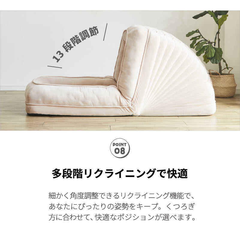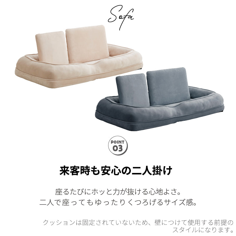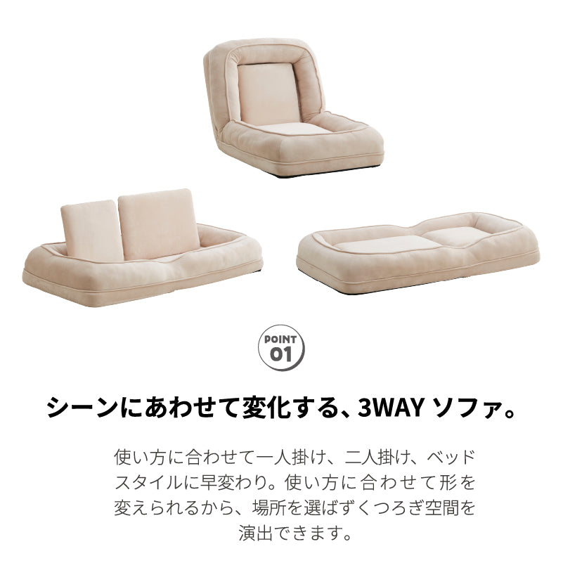・使い方自由自在、3WAY。1人掛けスタイル、2人掛けスタイル、ベッドスタイル ・お部屋の雰囲気に合わせて選べる2色展開 ・取り外し可能なクッション2つ付き ・ふかふかで大満足なボリュームと包み込まれるような座り心地。 |