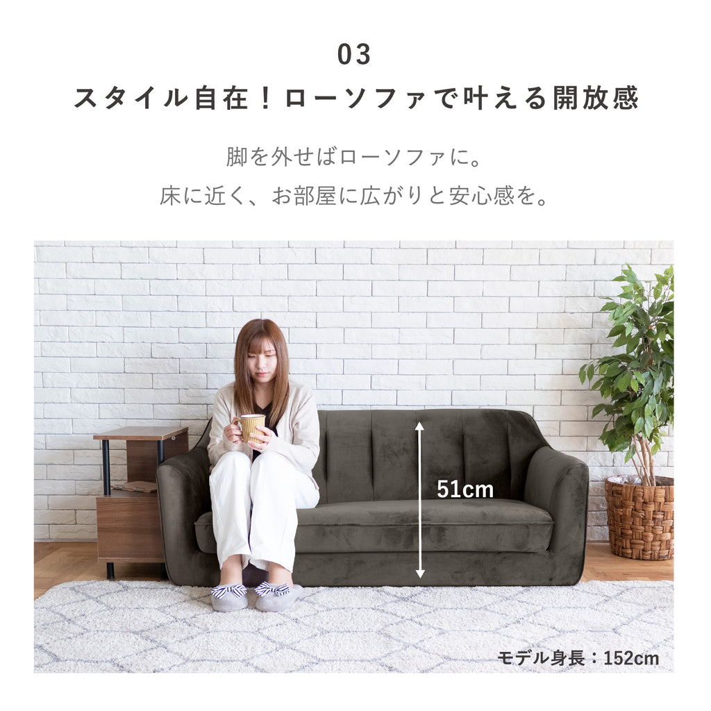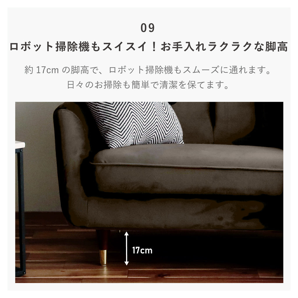 ・まろやかなラインの美しいデザイン ・手触りの良いベルベット生地 ・ローソファにしてさらにくつろぎを ・ゆったりとくつろげる座面の広さ ・上品な5色のカラーバリエーション ・ロボット掃除機も通れる脚高 |