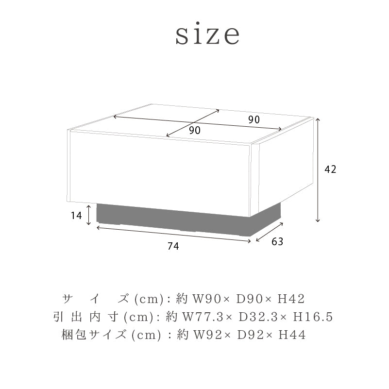 商品:約 幅90×奥行90×高さ42cm 引出内寸:約 幅77.3×奥行32.3×高さ16.5cm 梱包:約 幅92×奥行92×高さ44cm |