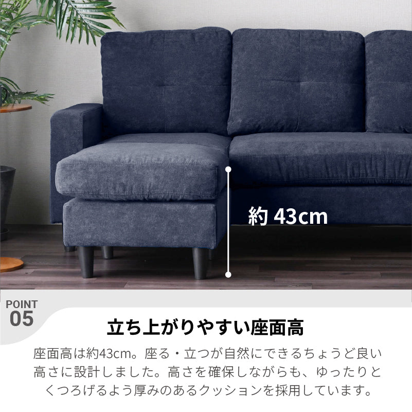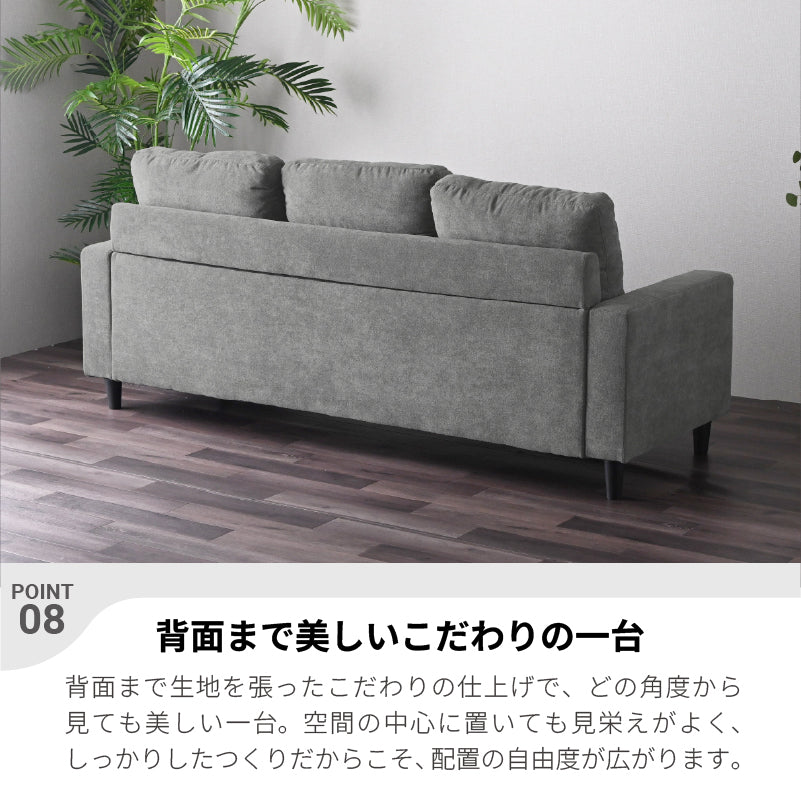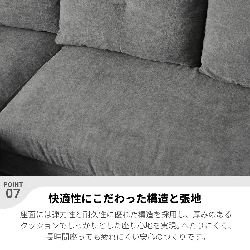 ・コンパクト設計ながらゆったりとした座り心地 総幅195cmと日本の住宅に合わせやすいコンパクト設計。 圧迫感を抑えながらも、大人3人がゆったりと座れる座面幅を確保しました。