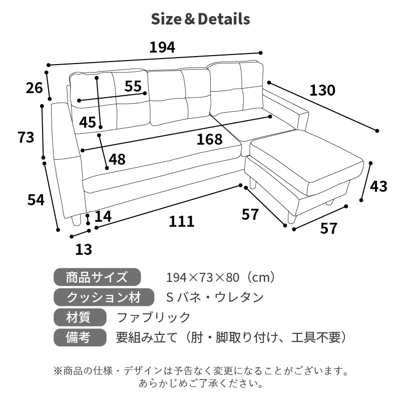 【商品】 3人掛けソファ:幅195×奥行73×高さ80cm スツール:幅52×奥行52×高さ29cm