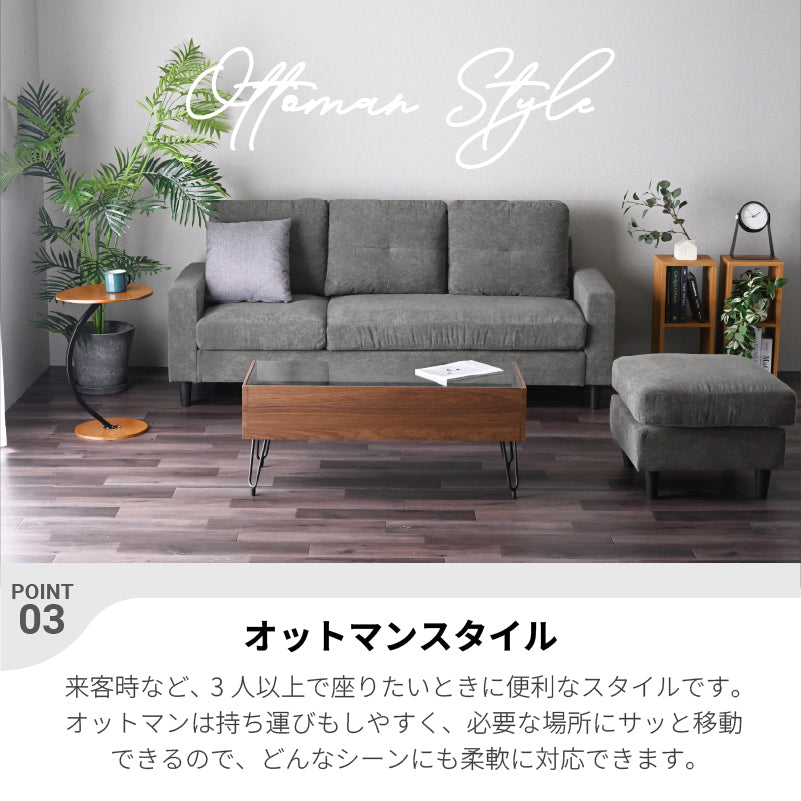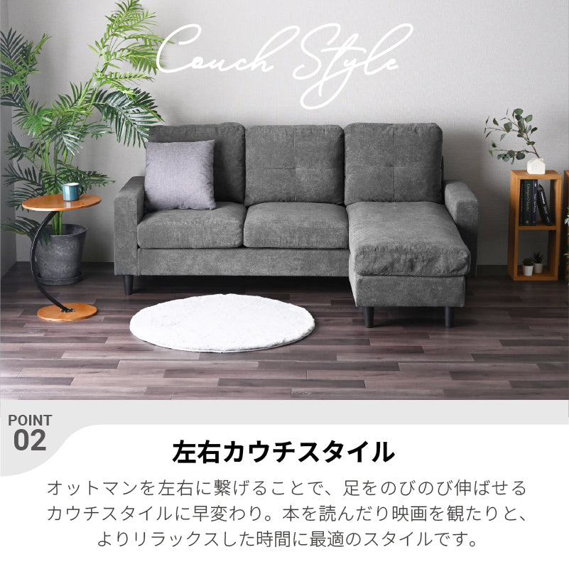 ・自由なレイアウトで理想の空間に 付属の独立したスツールを左右どちらに配置してもカウチスタイルが完成します。 L字スタイル(カウチ)、セパレートスタイル(オットマン)、3P+スツールの3通りのレイアウトをお楽しみいただけます。