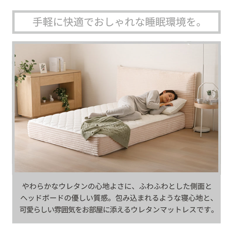 表面材:ファブリック ヘッドボード:ファブリック・ファイバーフィル・ウレタンフォーム 中材:ポリエステル・ファイバーフィル・ポケットコイル・ウレタンフォーム・フェルト・湿気吸収剤入り |